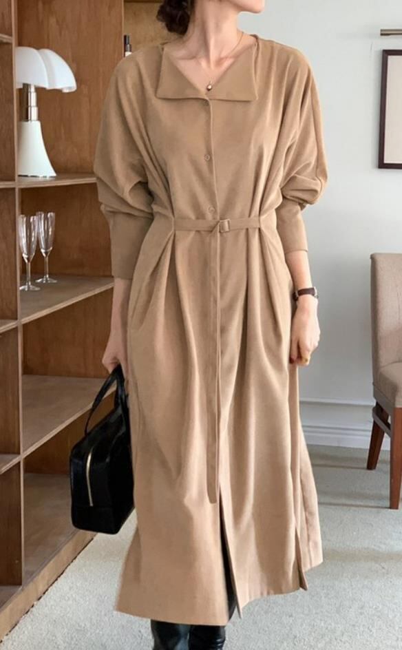 シンプルでありながらもエレガントなデザインが魅力の一枚です。リボンベルト付きで、スタイルアップと女性らしさを同時に叶えます。