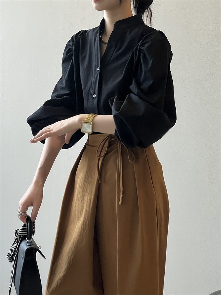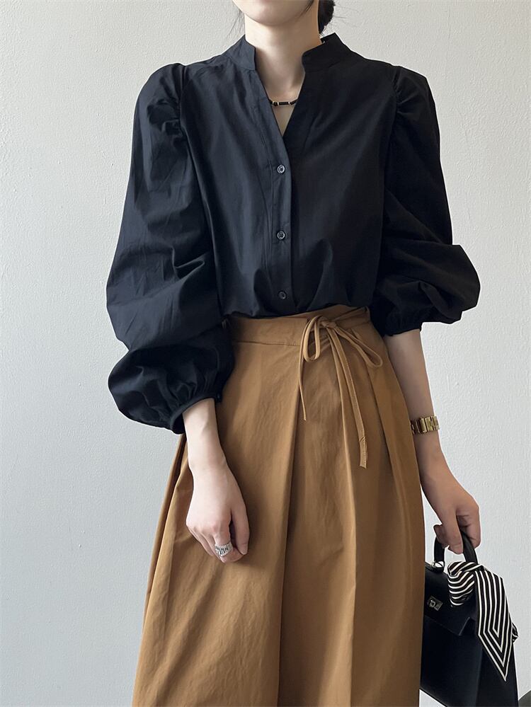 スタンドカラー襟とボリューム袖が絶妙にマッチしたこのブラウスは、あなたのワードローブに新しい風を吹き込む一着です。ぜひ、このエレガントでモダンなブラウスを取り入れて、毎日のコーディネートを楽しんでください。